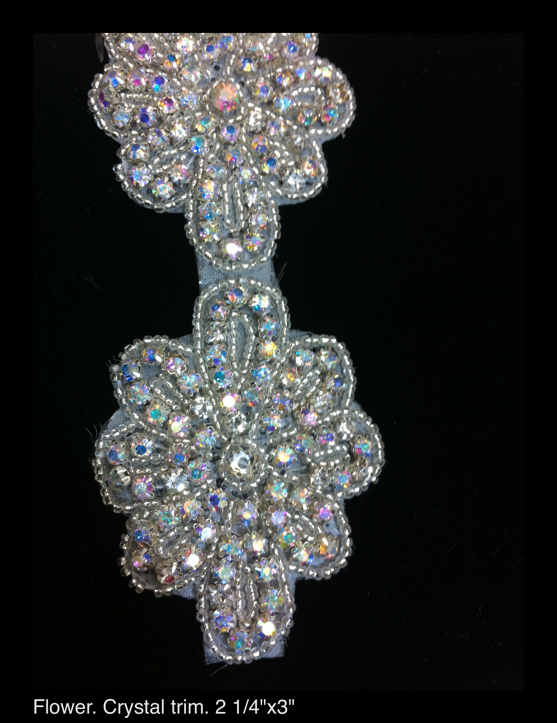 Flower. This is a handmade crystal trim made from clear czech crystals on a mesh material and a rubber backing. Each pattern measures 2 1/4" wide x 3" long. Sold per patch.
