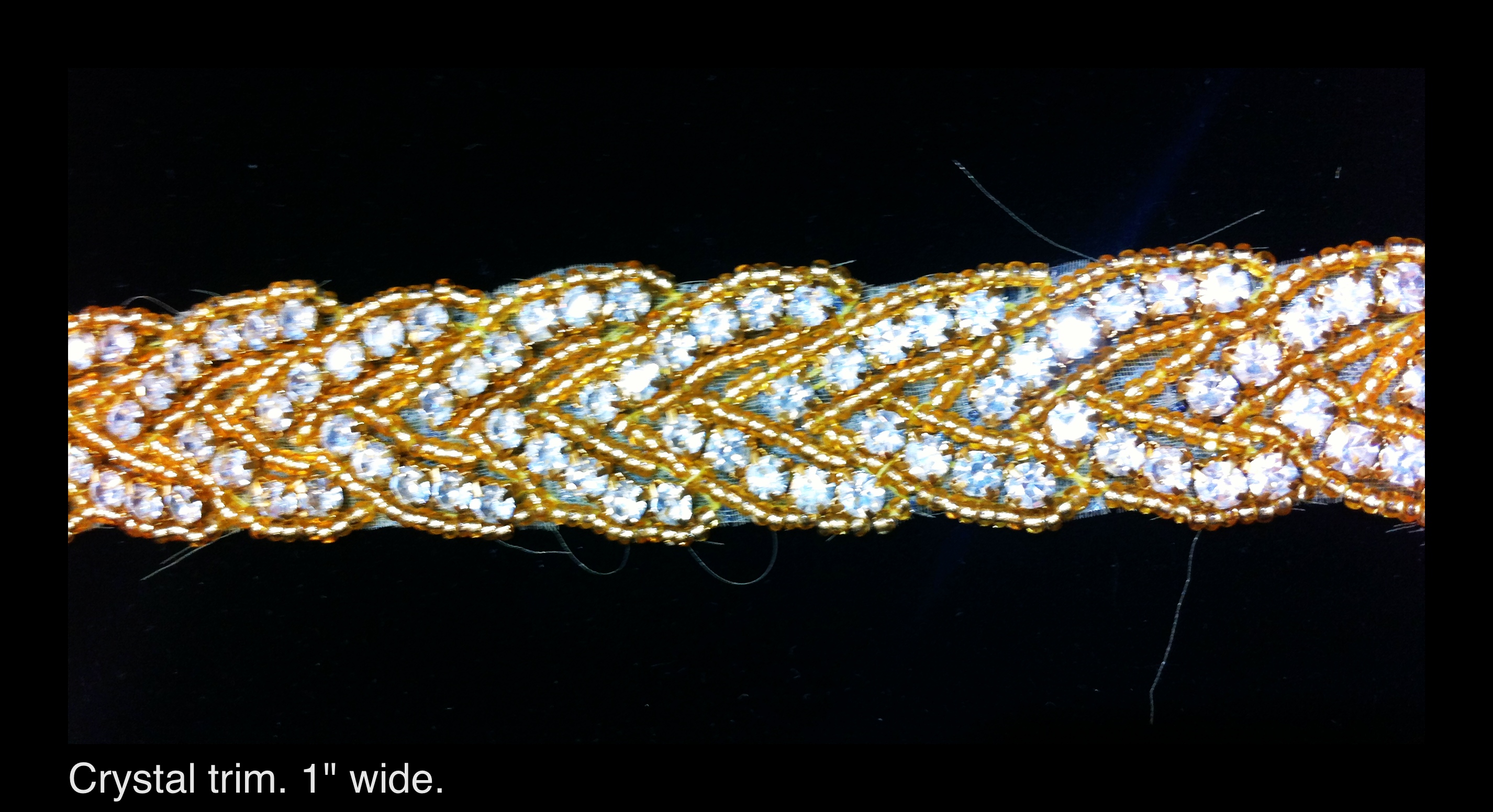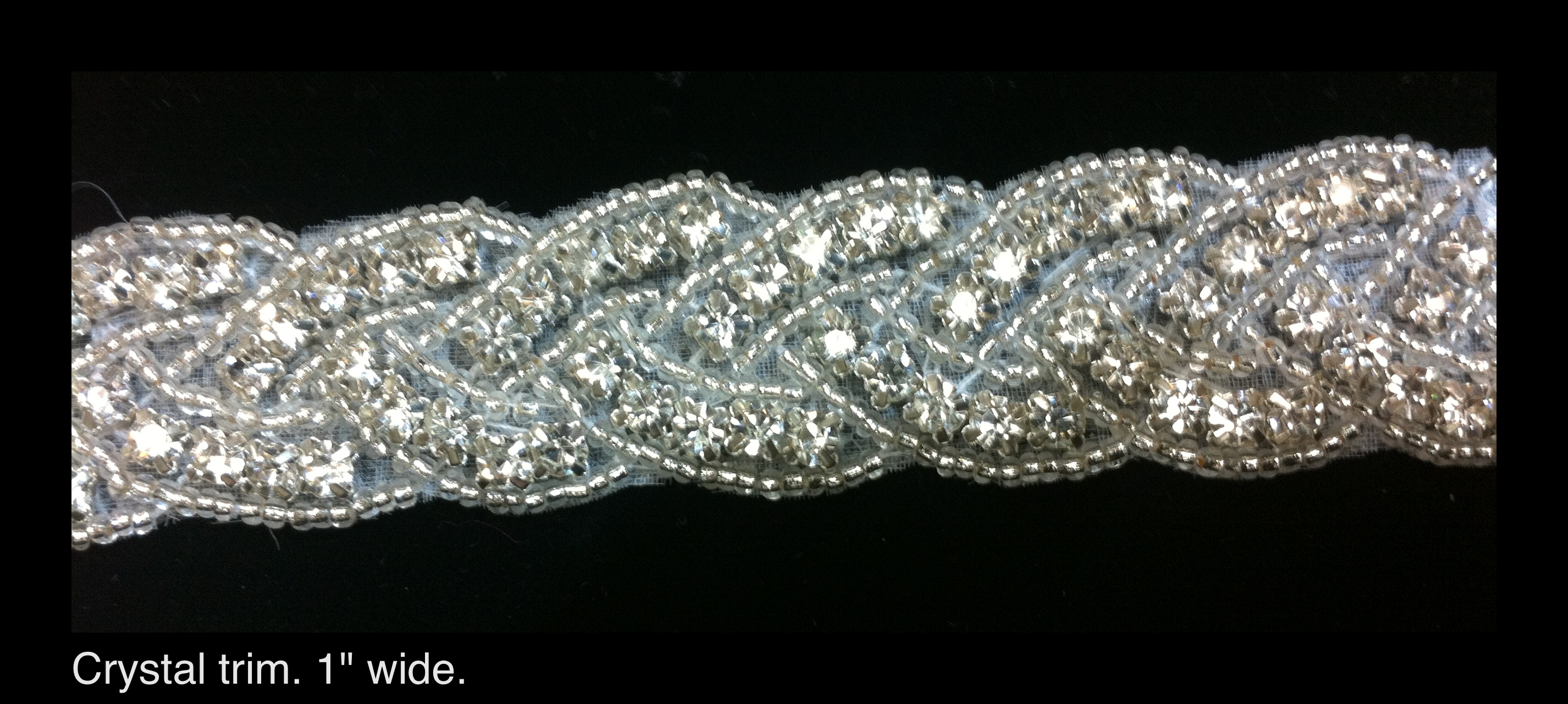 Belt. This is a handmade crystal trim made from clear czech crystals on a mesh material and a rubber backing. Pattern measures 1" wide . Sold Per 1/2 Yard