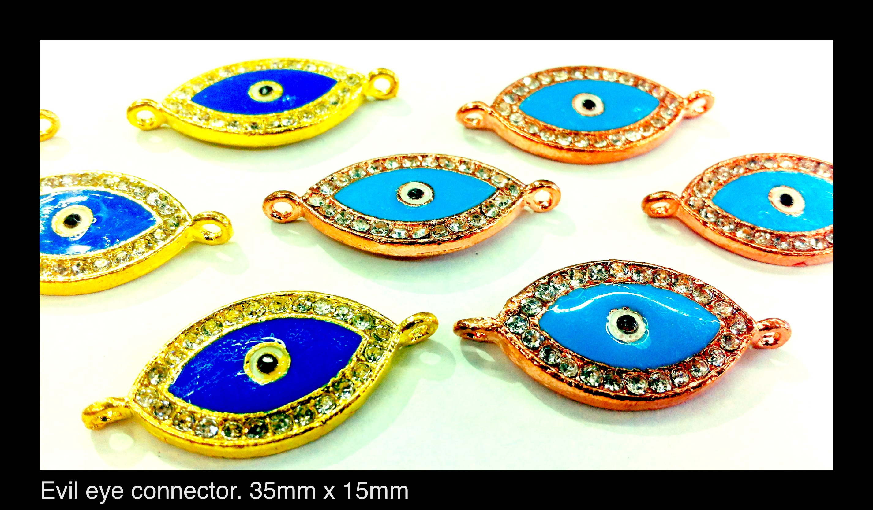 Evil Eye connector. 35mm x 15mm. Clear rhinestone encrusted on plated metal. Pupil is enamel.