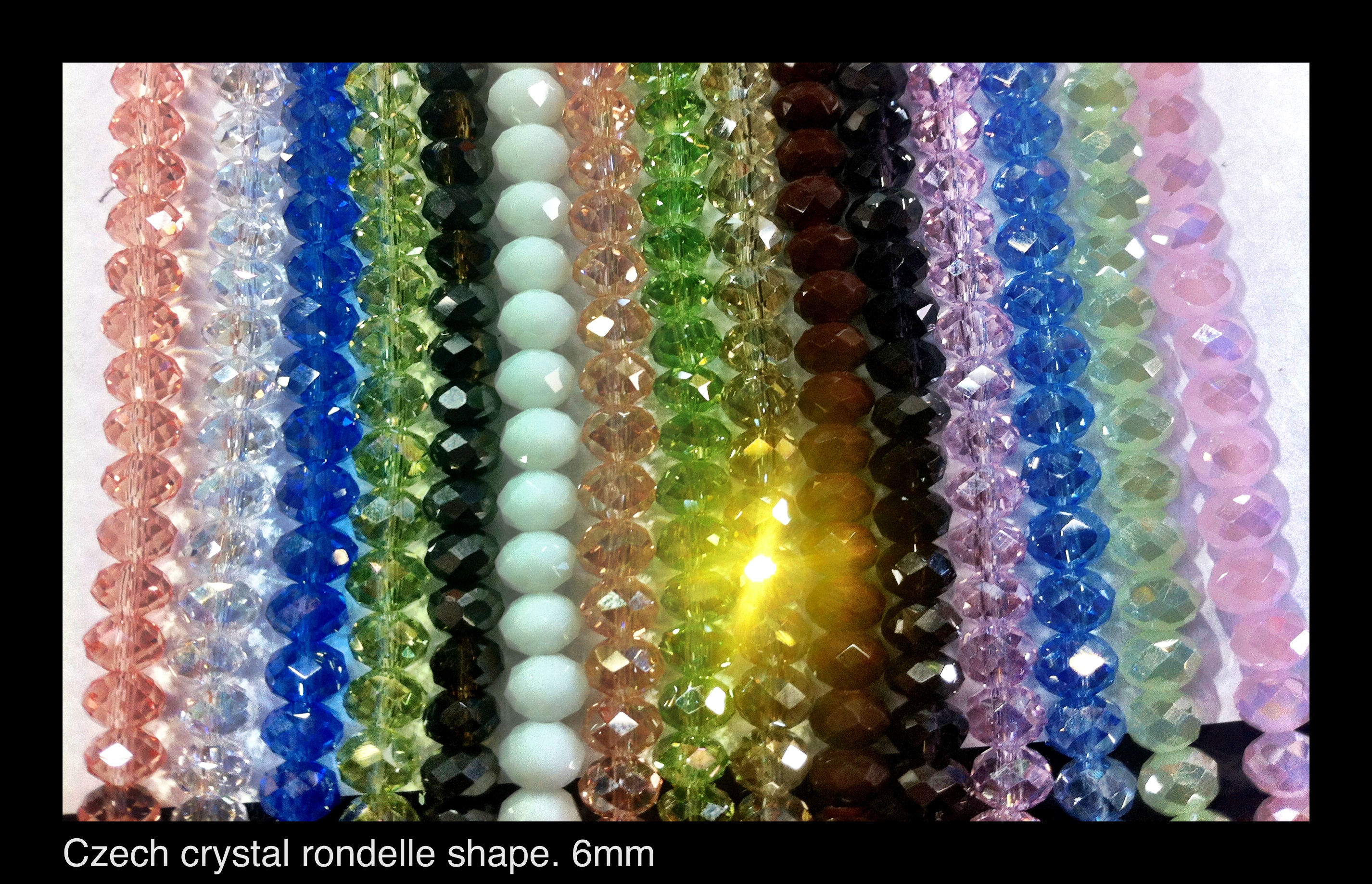 Czech Crystal rondelles. 6mm rondelle shape. sold by the strand. Strands come with approx. 40-50 pcs to the strand depending on the finish. (PLEASE NOTE: please refer to the picture and locate your preferred color from left to right)