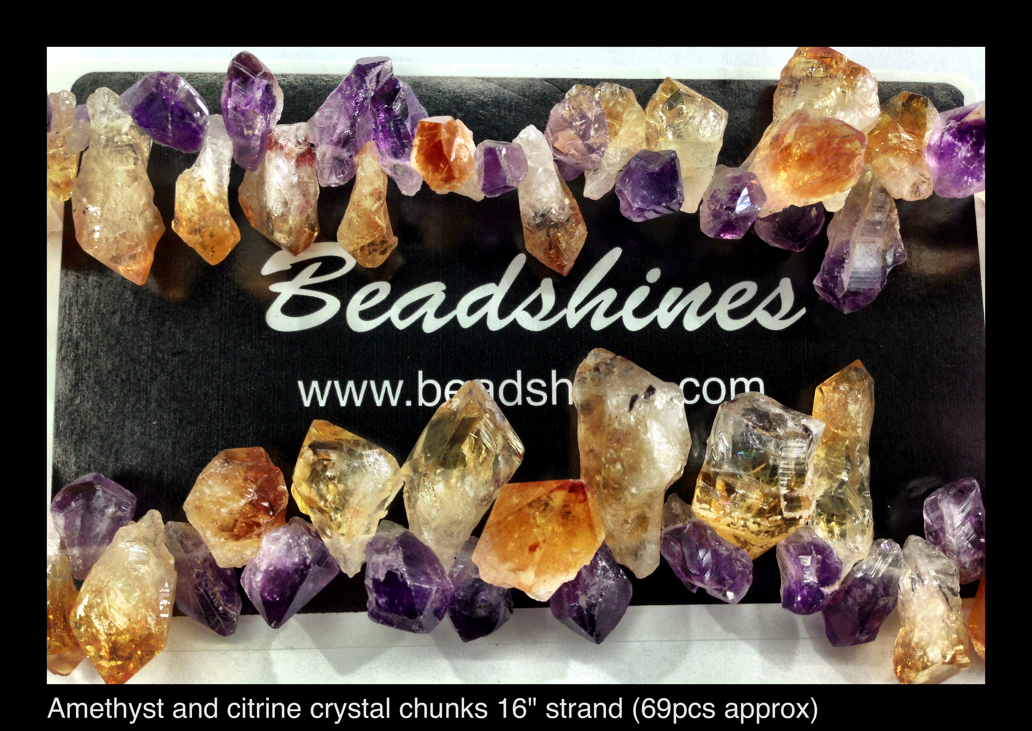 This strand is a mix of Amethyst and Citrine Crystals chunks. Unpolished. Each crystal measures, roughly,14mm x 8mm. 16" strand with approximately 69 pcs.