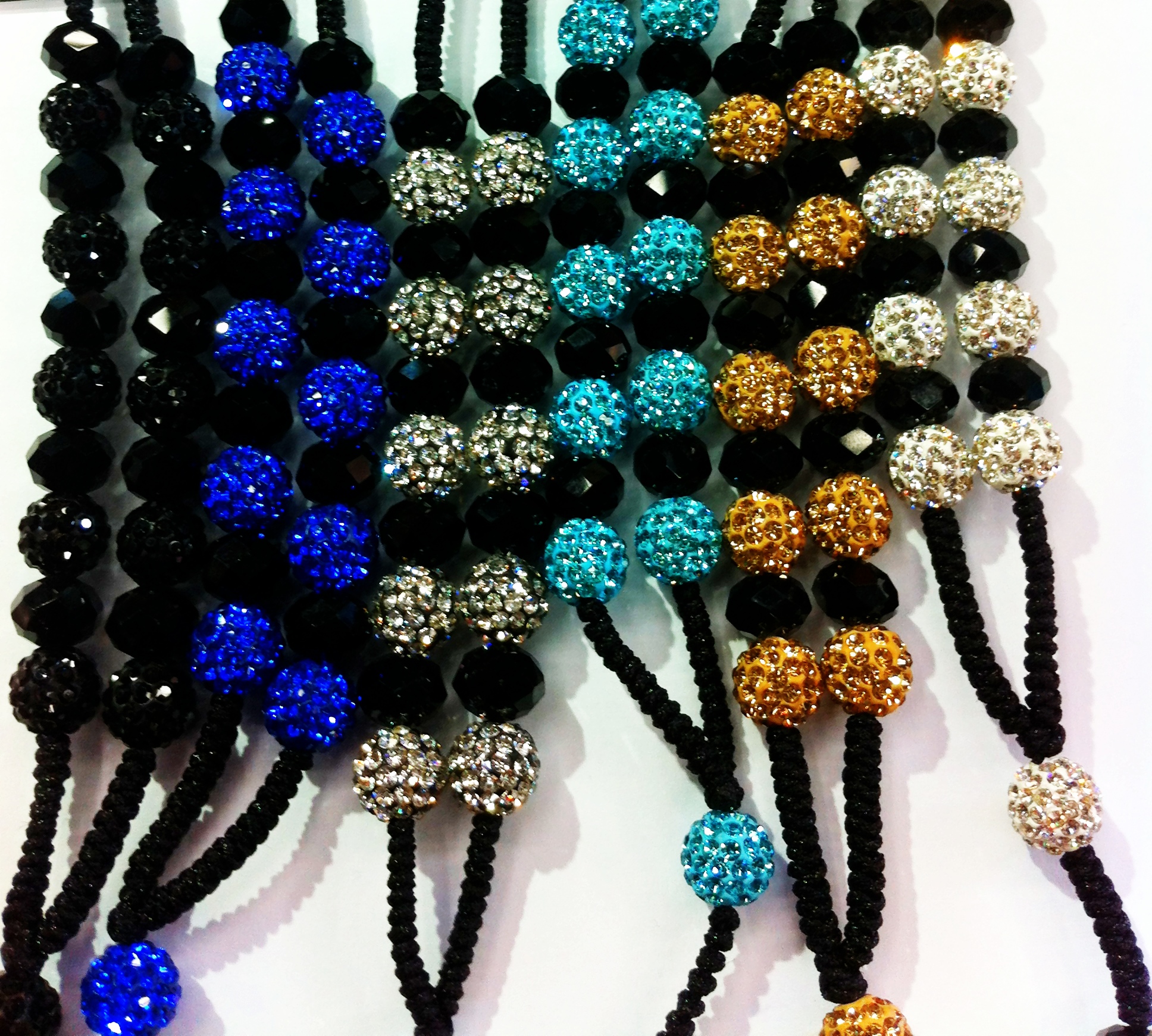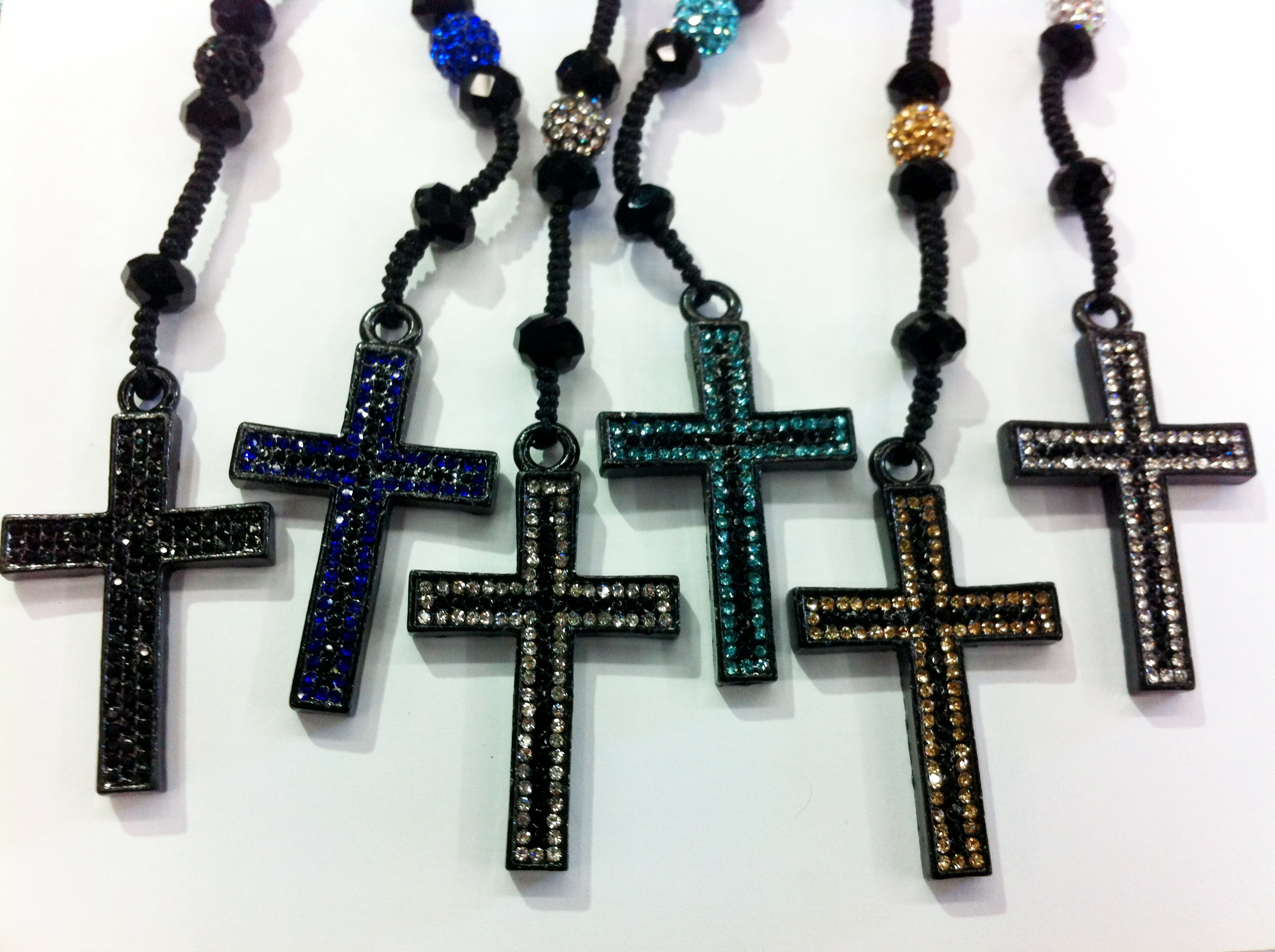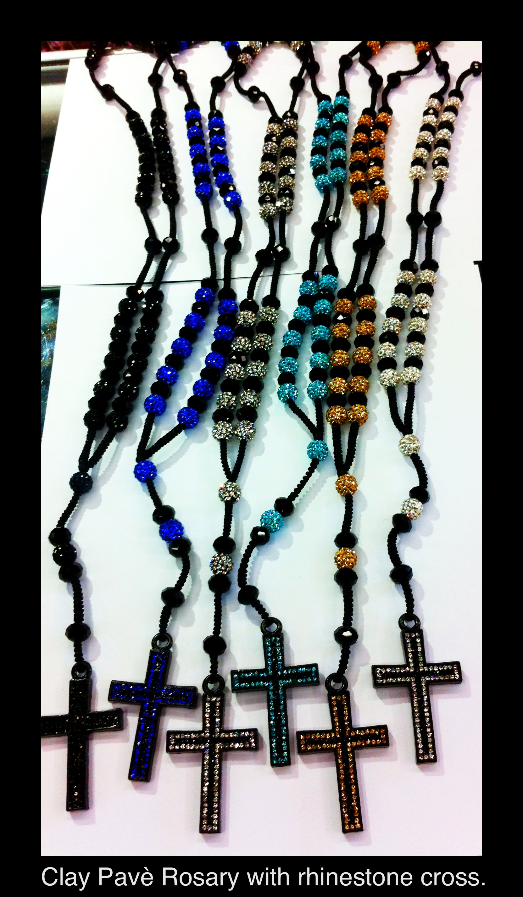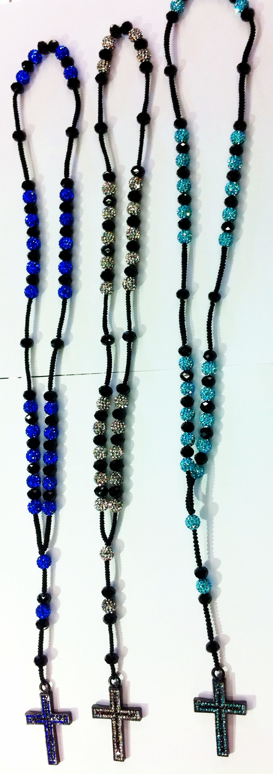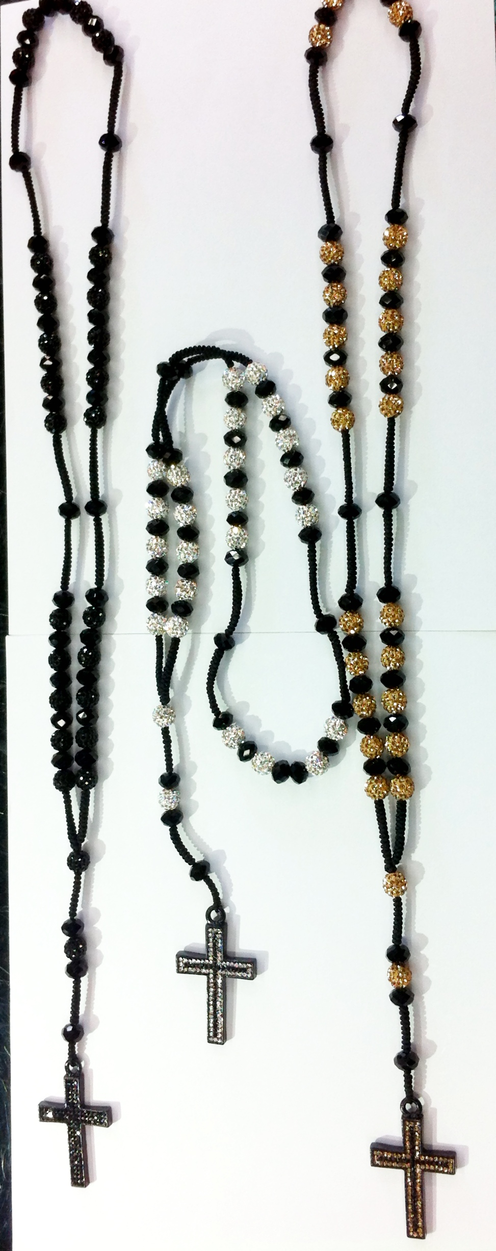 Rosary Style Necklace made with 10mm micro pavé beads and black crystal rondelle beads on a silky black rope. 20" long. Cross is encrusted with 2 rows of rhinestones.