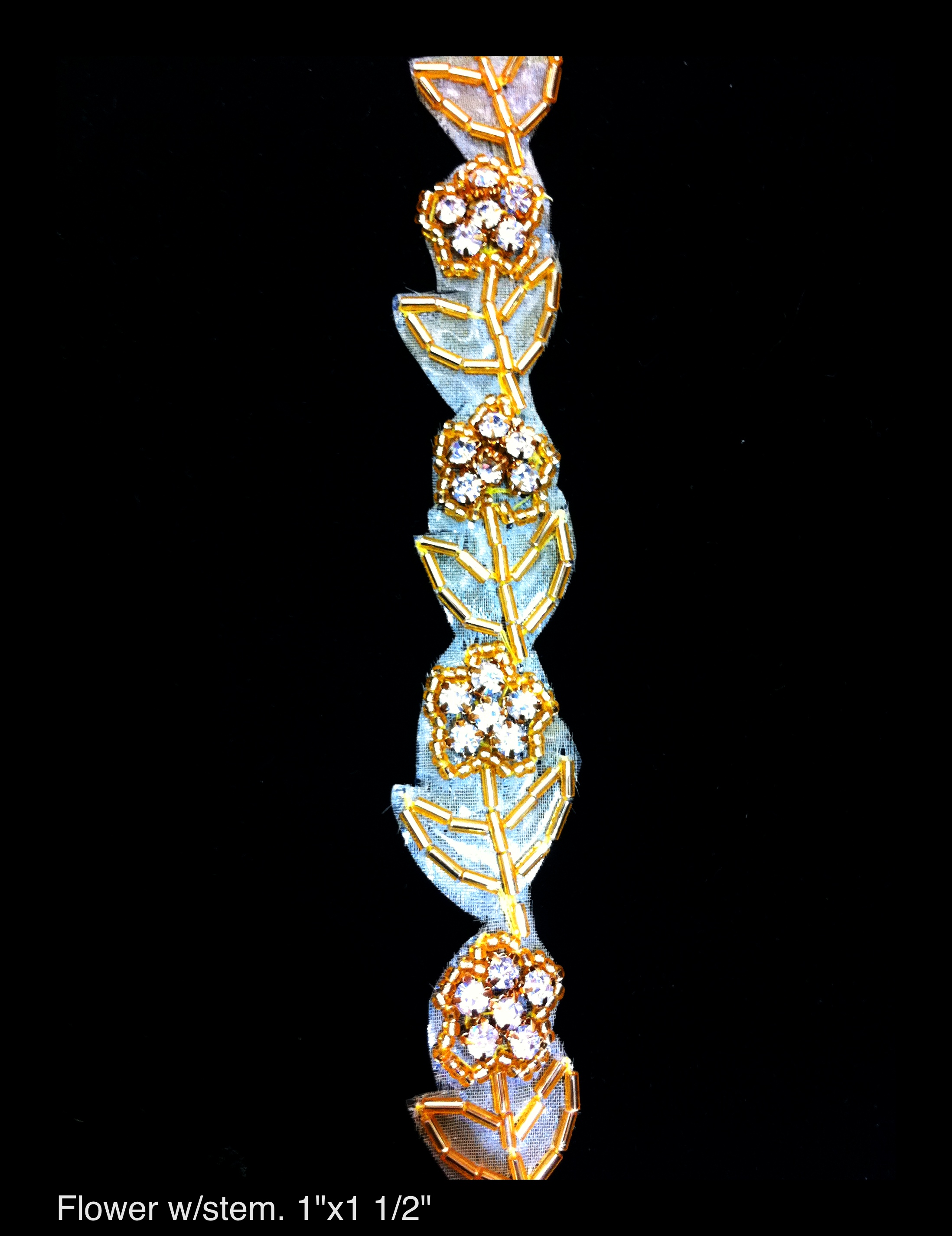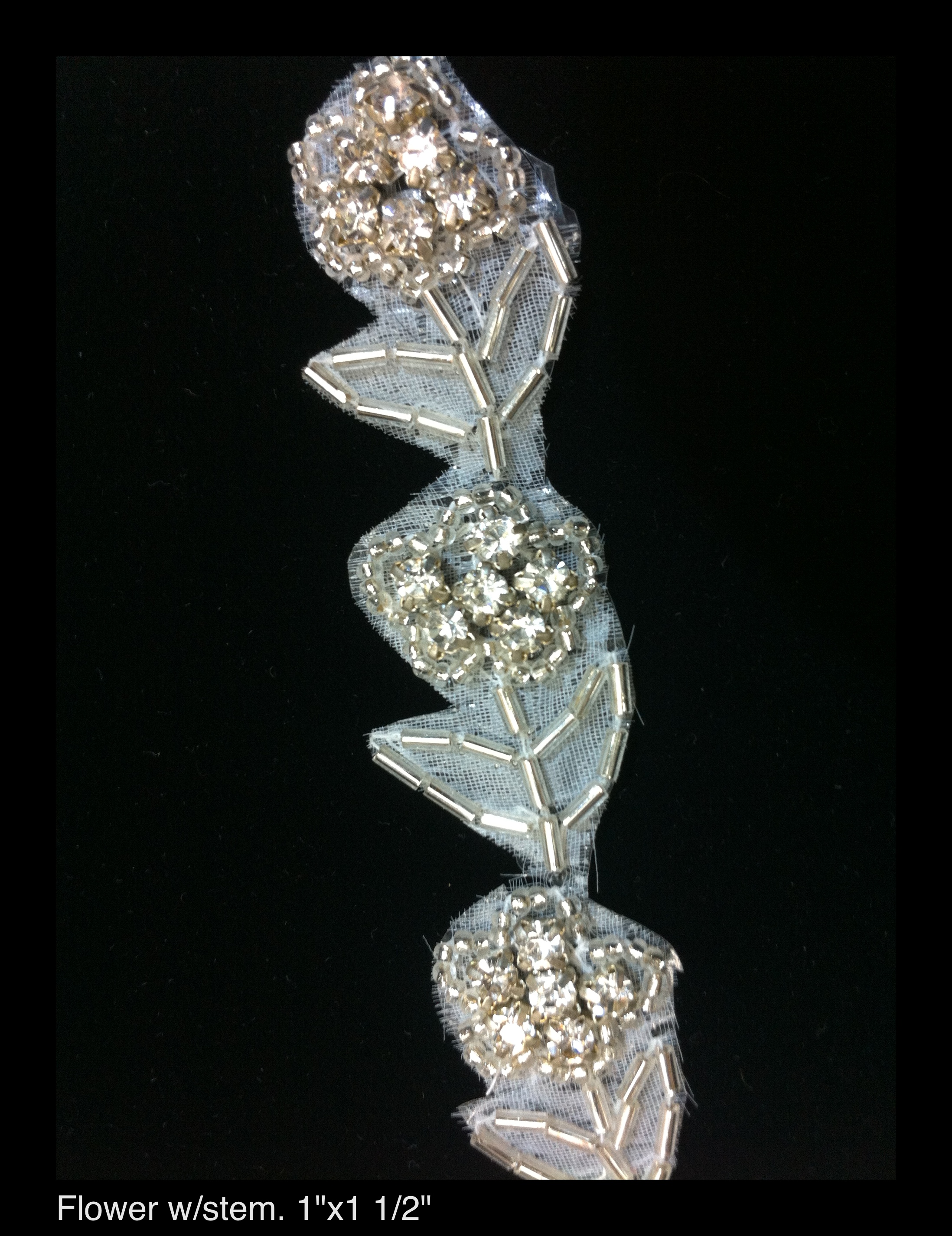 Flower with Stem. This is a handmade crystal and seed bead trim made from clear czech crystals and czech seed beads on a mesh material and a rubber backing. Pattern measures 1" wide x 1 1/2" long. Sold Per Yard