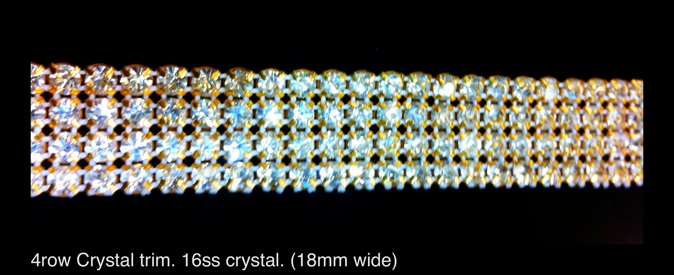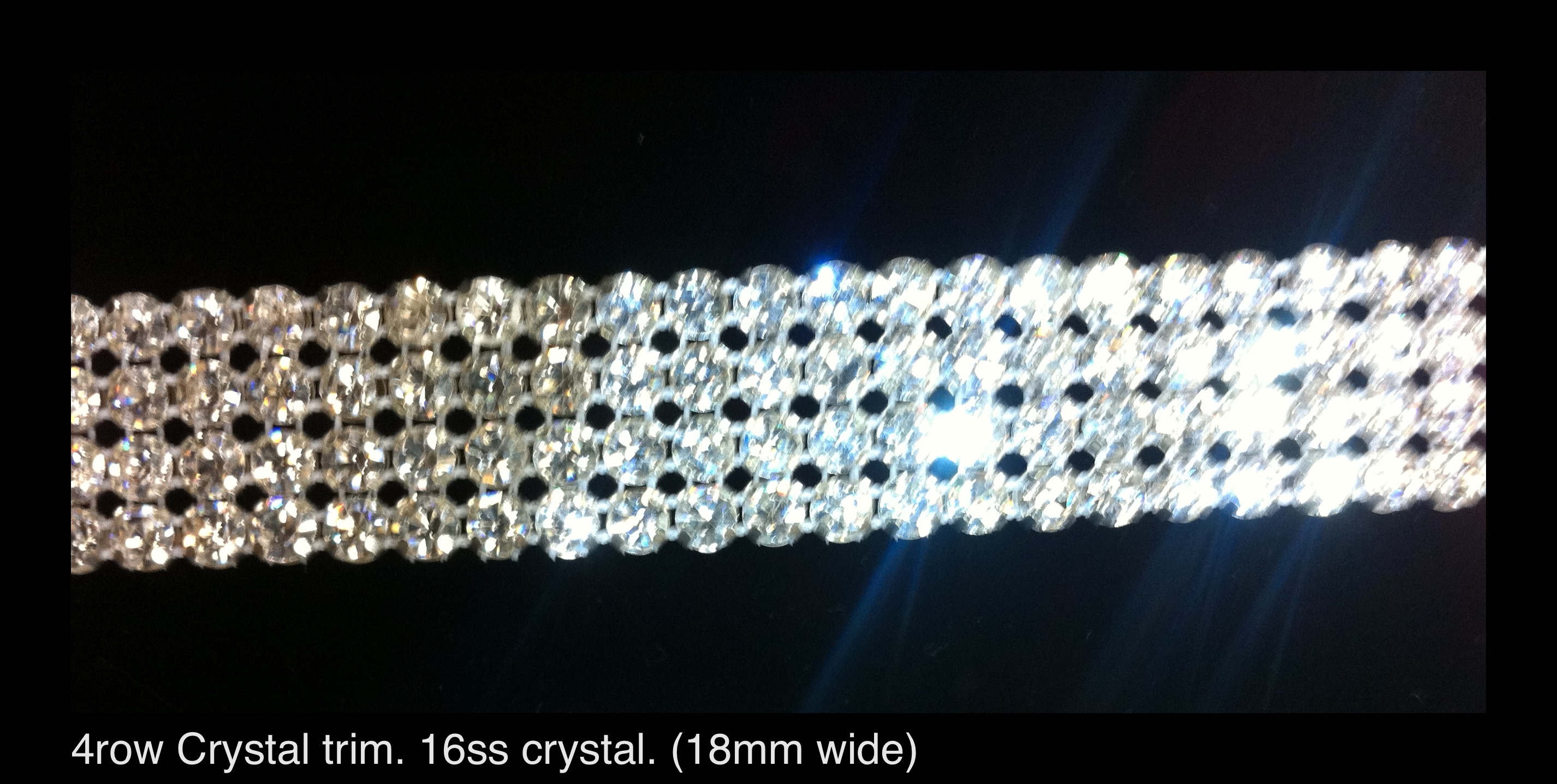 Crystal Trim. 4 row. 16ss Crystal (18mm wide) This is a handmade crystal trim with 16ss clear czech crystals on a mesh material . Pattern measures 18mm wide . Sold Per Yard